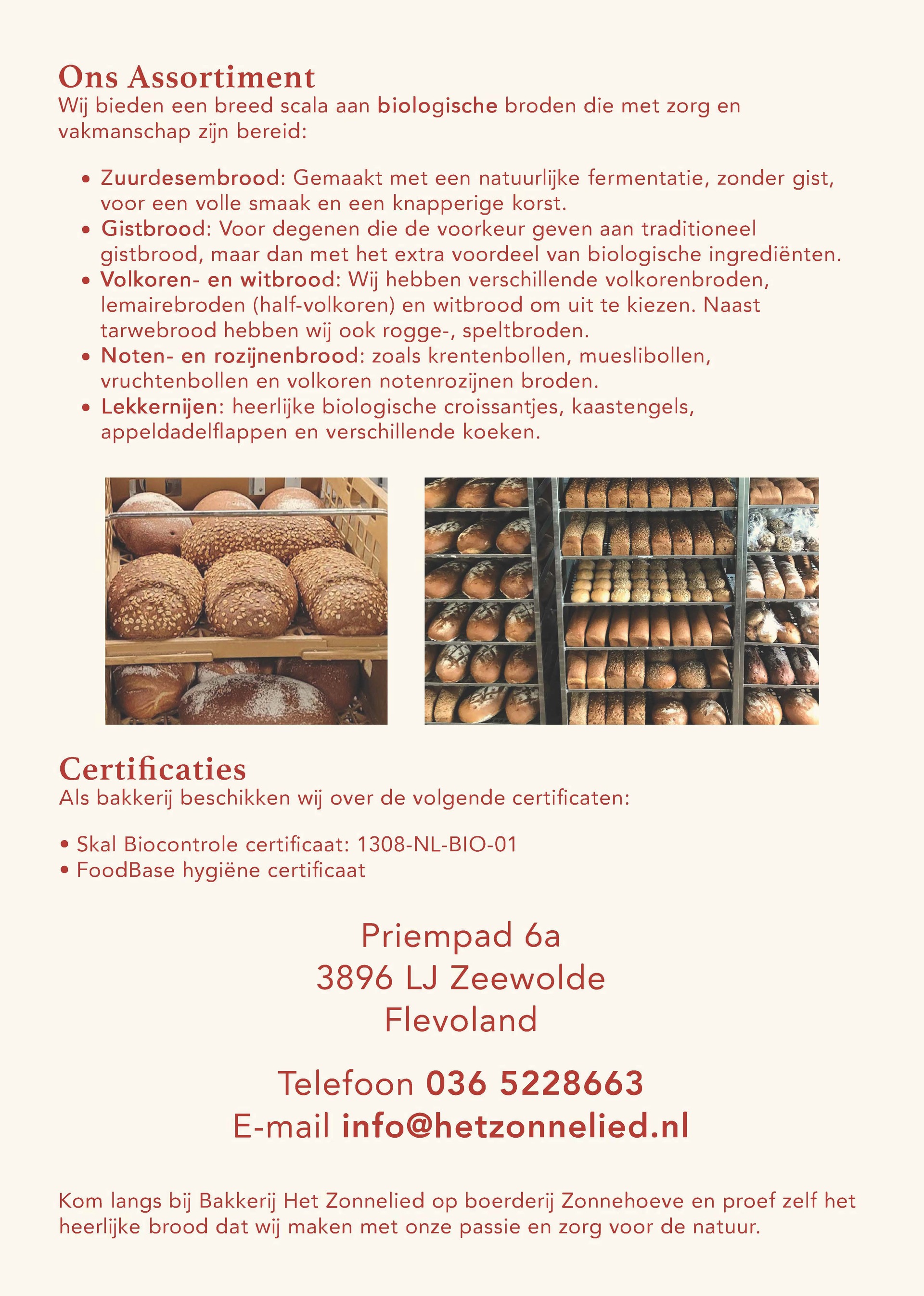 Bestellingen kunnen van dinsdag tot en met vrijdag worden afgehaald bij Bakkerij Het Zonnelied, Priempad 6A, Zeewolde.